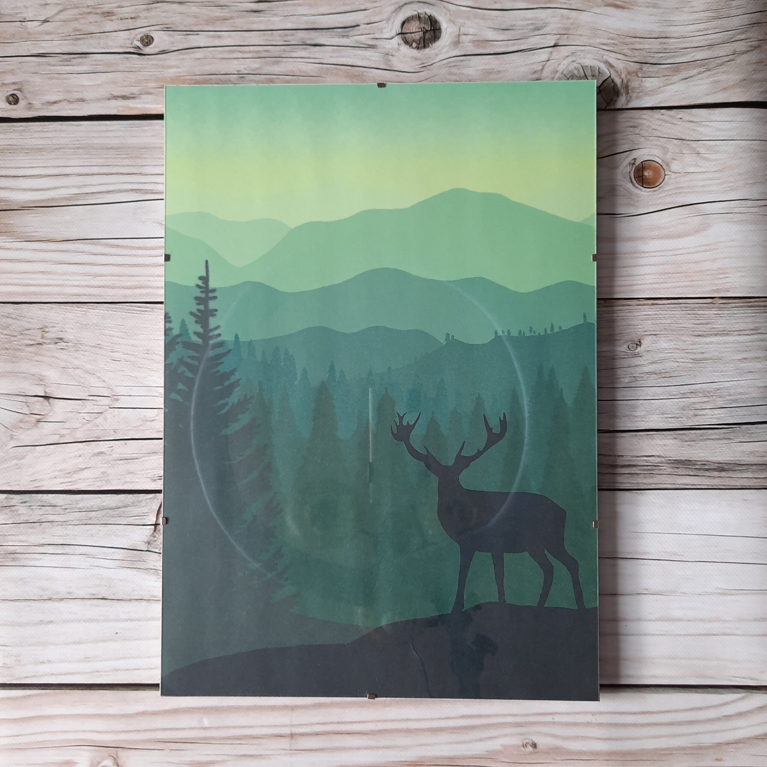 Ta monochromatyczna ilustracja z obrysem jelenia na pierwszym planie została namalowana przeze mnie w programie graficznym. Idealnie wpasuje się do salonu czy sypialni w stylu skandynawskim. Będzie to również świetny prezent, do którego nie będziesz musiał/a szukać antyramy, ponieważ jest ona zawsze w zestawie.